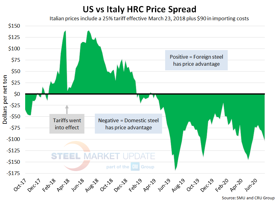 CRU published Italian HRC prices at $391 per net ton, up $5 from last week and up $6 over two weeks ago. After adding tariffs and import costs, the delivered price of Italian HRC is approximately $579 per ton. Accordingly, domestic HRC is theoretically $104 per ton cheaper than imported Italian HRC; the spread was $93 the previous week and $81 two weeks prior. U.S. prices have held this price advantage for over one year.