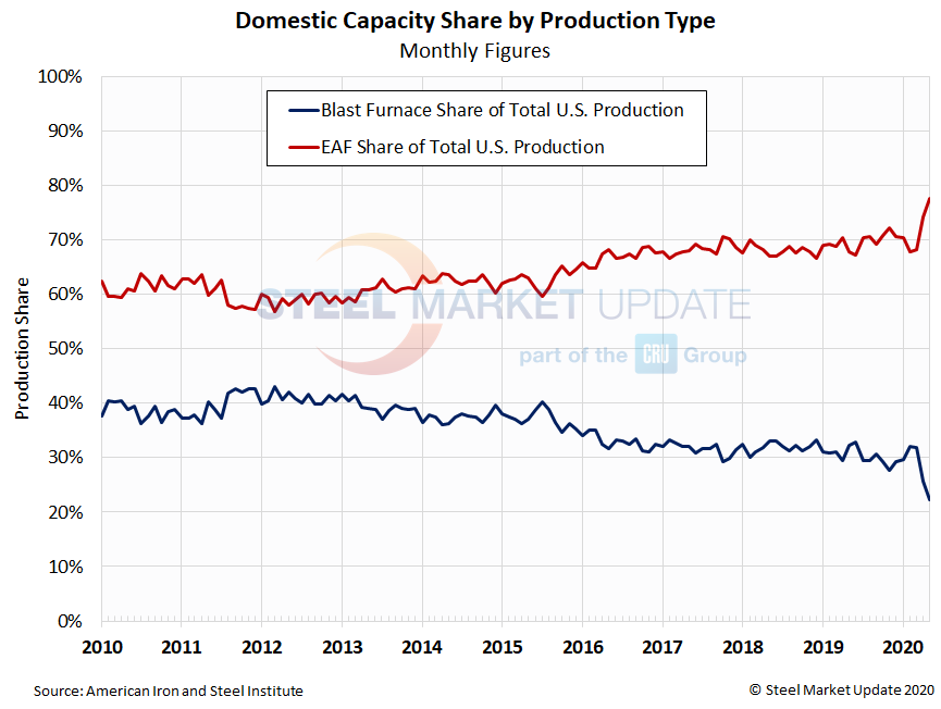 May production was 100,000 tons higher than April, but 2,911,000 tons lower than the same month last year. AISI’s monthly estimates are different than the weekly estimates SMU reports each Tuesday; the monthly estimates are based on over 75 percent of the domestic mills reporting versus only 50 percent reporting for the weekly estimates.