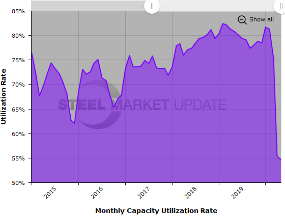 The mill capacity utilization rate for May averaged 54.6 percent, down from 55.4 percent in April, and down from 80.8 percent one year ago.