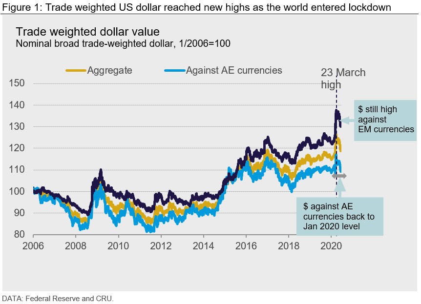 Prior to Covid-19, there was widespread agreement that the TW$ was overvalued relative to fundamentals by about ~10 percent. Since then the dollar has strengthened further, such that TW$ reached new highs on March 23 (Figure 1). Some of that strength has unwound. Commodity market participants may be considering where next for the dollar, given its strong link to commodity prices. This insight sets out CRU’s view on three major commodity currencies—the RMB, the real and the rouble.