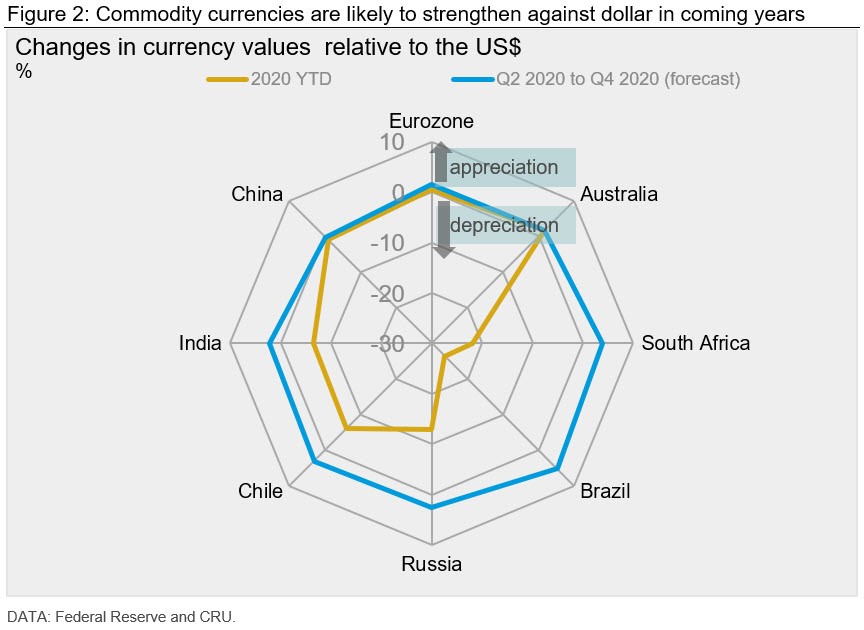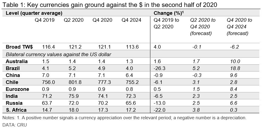 There is widespread agreement that the dollar is overvalued by around 10 percent. CRU expects the trade weighted dollar (TW$) to remain overvalued and broadly stable for the rest of 2020, as pandemic uncertainty continues to support the dollar as a “safe-haven” currency. The stability of the TW$, however, hides important changes in bilateral currencies: the RMB is forecast to remain stable for the rest of the year while the Russian rouble and Brazilian real gain 3 percent and 5 percent, respectively, against the dollar. We expect the TW$ to fall materially between 2021 and 2024, returning it to fair value as pandemic uncertainty fades and fundamental forces reassert themselves.