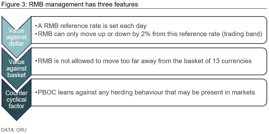 The RMB has been among one of the most stable currencies in the world since mid-2016. It has fallen by less than 1 percent against the dollar this year. The RMB’s stability is partly by design since it is a managed currency rather than a free-floating currency. It is also partly a result of how the basket of currencies has moved recently. This regime operates under three constraints described in Figure 3.