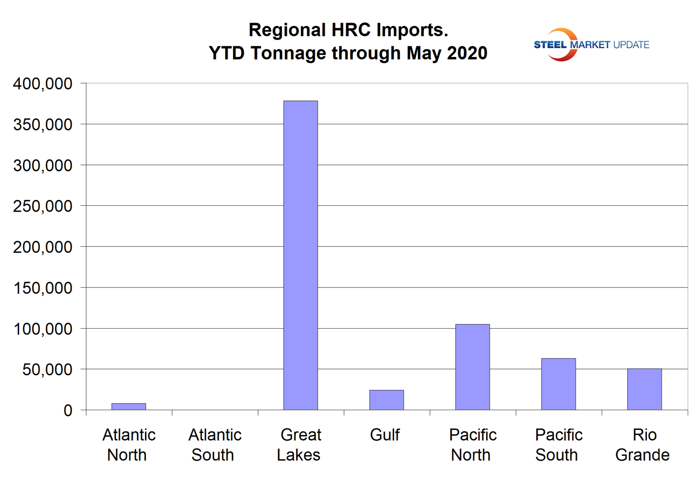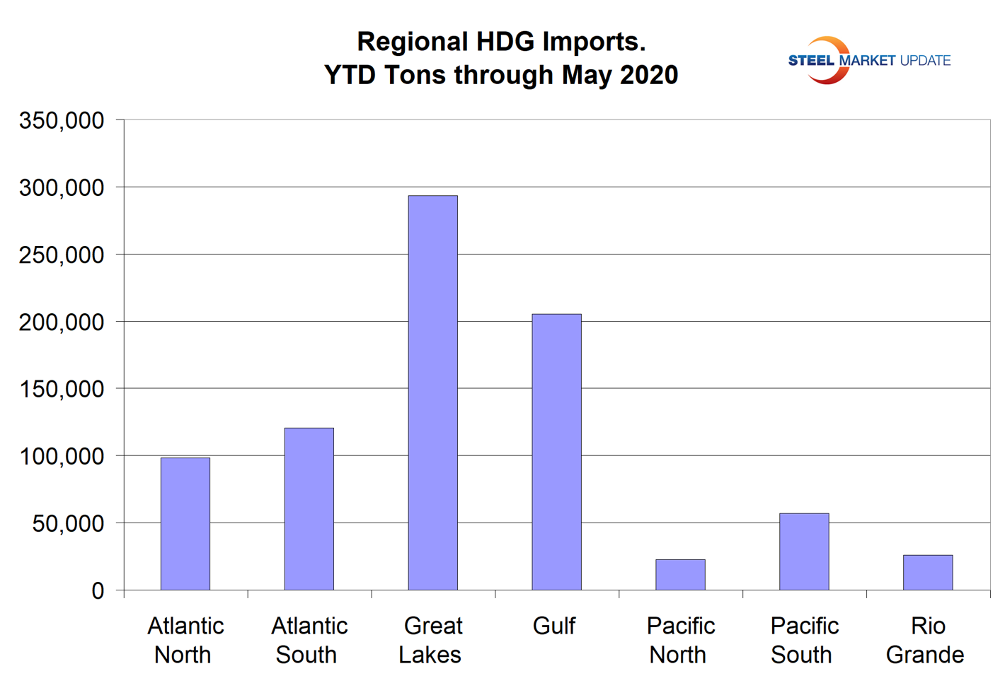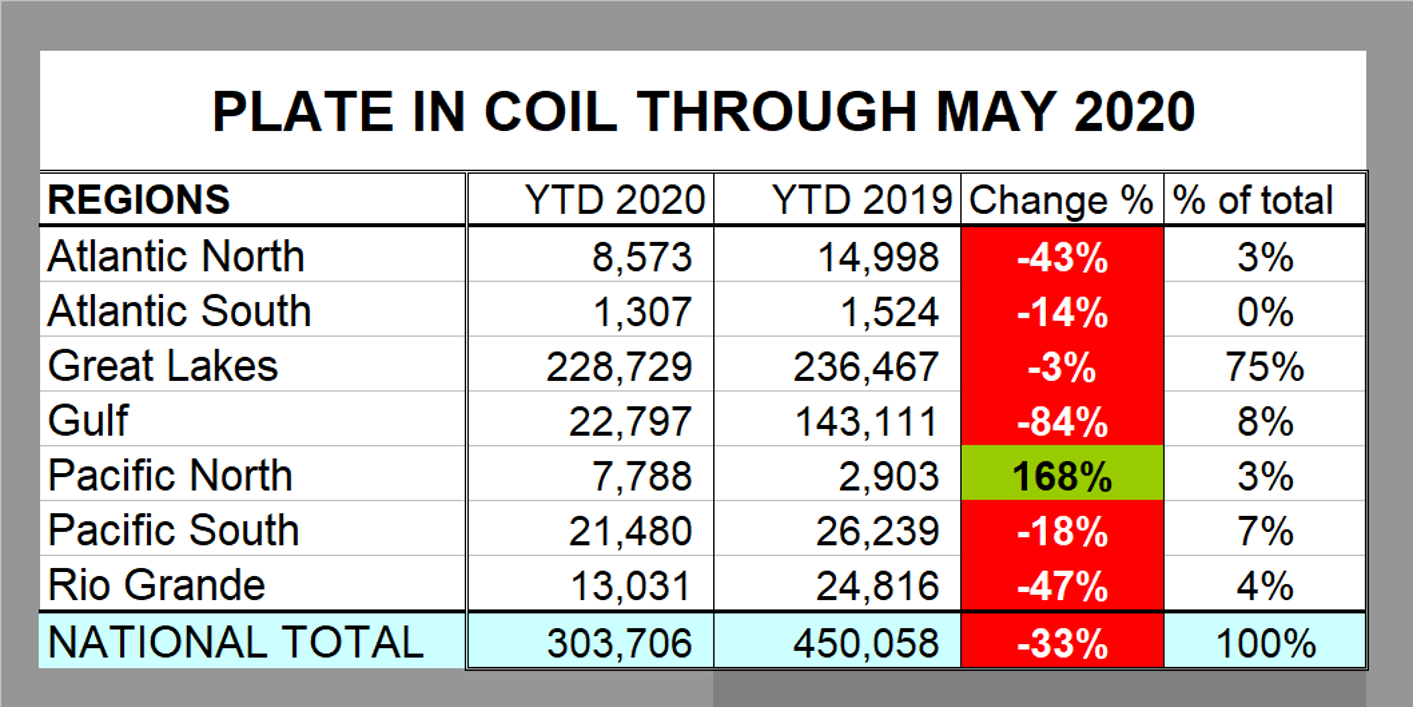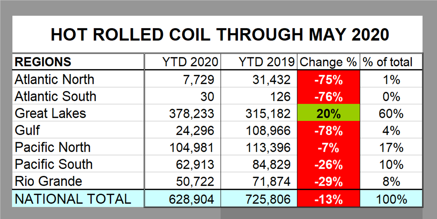 National level import reports do a good job of measuring the overall market pressure caused by imports of individual products. The downside is that there are large regional differences. This report breaks the total year-to-date import tonnage of six flat rolled products into seven regions and shows the growth or contraction for each product and region. There is a summary table for each product group and a bar chart showing volume by region for the first five months of 2020. These are reference documents with no specific comments.