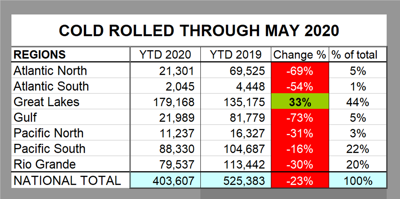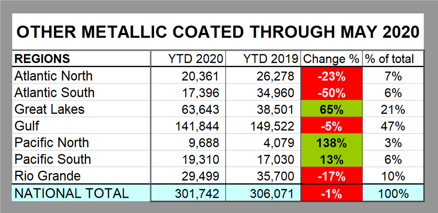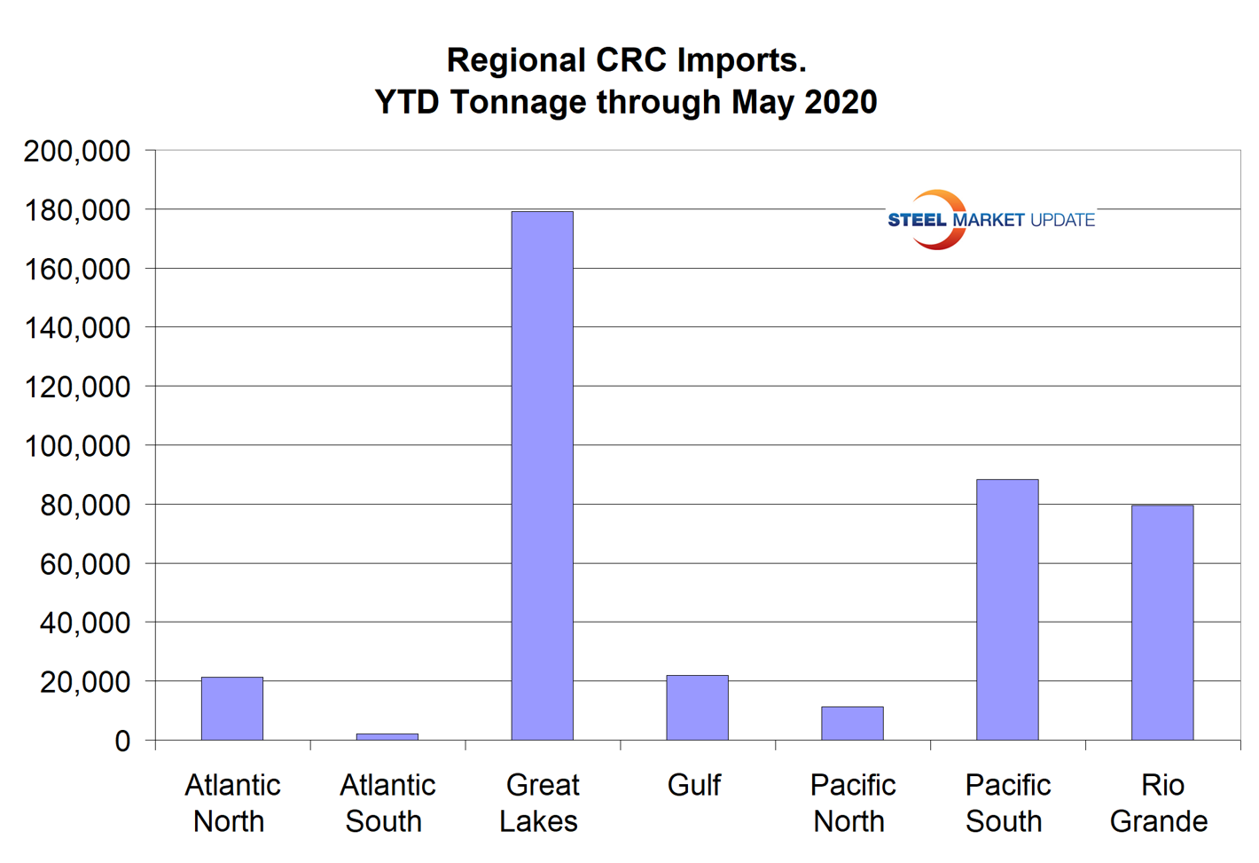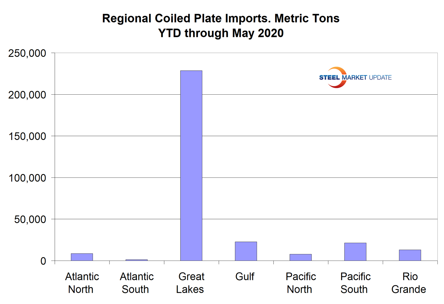 National level import reports do a good job of measuring the overall market pressure caused by imports of individual products. The downside is that there are large regional differences. This report breaks the total year-to-date import tonnage of six flat rolled products into seven regions and shows the growth or contraction for each product and region. There is a summary table for each product group and a bar chart showing volume by region for the first five months of 2020. These are reference documents with no specific comments.