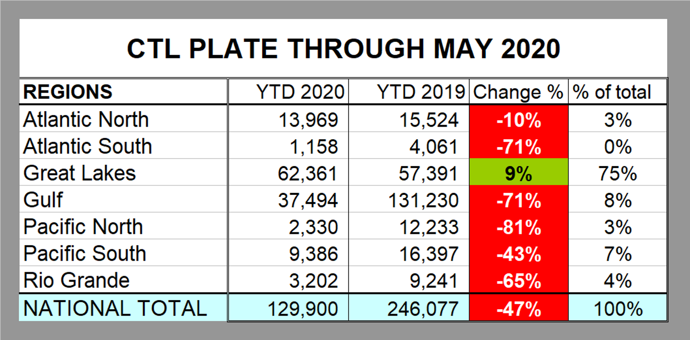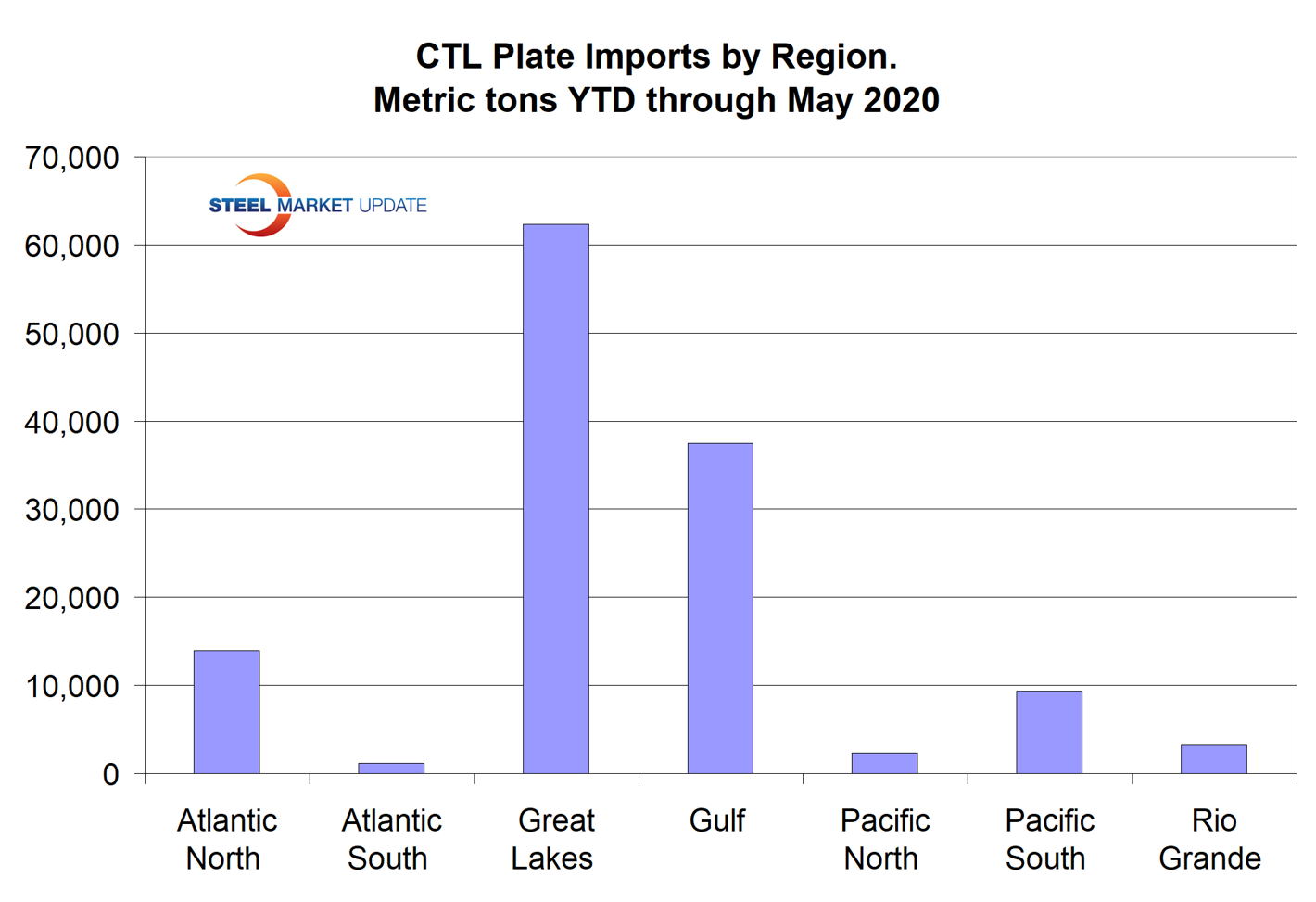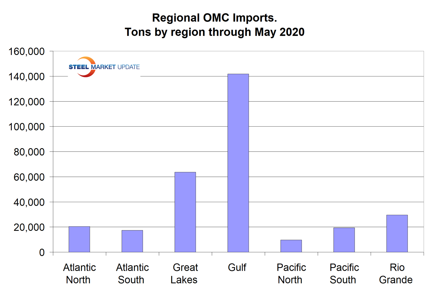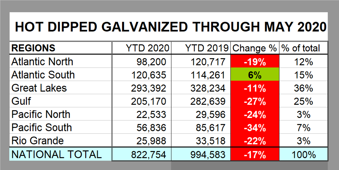 National level import reports do a good job of measuring the overall market pressure caused by imports of individual products. The downside is that there are large regional differences. This report breaks the total year-to-date import tonnage of six flat rolled products into seven regions and shows the growth or contraction for each product and region. There is a summary table for each product group and a bar chart showing volume by region for the first five months of 2020. These are reference documents with no specific comments.