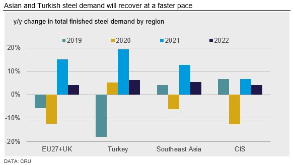 Although we expect Turkey to recover at a faster pace from Covid-19 compared with other European countries, this recovery comes off a lower base as the country emerges from recession. However, Turkey itself is an important supplier of steel to the EU and limited export opportunities there—now further reduced following the quota revision—are already causing Turkish mills to run at lower capacity utilization rates.
