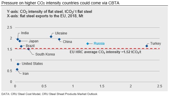 One proposed measure of implementing the CBTA is to charge importers on the basis of a single product wide benchmark. The chart below shows the CO2 intensity of HR coil production for the top 10 exporters to the EU. On average, Russian mills produce HR steel with a higher CO2 intensity than the average EU producer and, if a tariff were applied based on this relative intensity, Russian producers would be penalized overall, but less than exporters from China and Ukraine. Russian producers that can reduce the CO2 intensity of their steel production and/or redirect already low CO2 intensity steel to the EU market could improve their competitive position under this CBTA proposal.