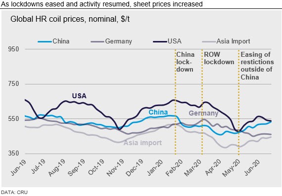Steel sheet demand collapsed by 17 percent q/q in 2020 Q2 as country after country implemented lockdowns to combat Covid-19. Covid-19 wiped out the equivalent of a decade of global growth. This resulted in lower capacity utilization and, as producers competed for what demand remained, they cut prices. Falls were greatest in Asia and the U.S., but drifted down slowly in Europe.
