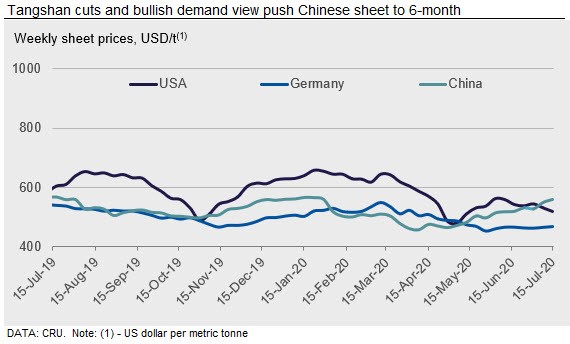 Prices in the Chinese domestic sheet market rose by RMB30-80 /t over last week. Market participants’ confidence over firm underlying sheet demand, especially for CR and coated sheets, has resulted in active purchases for these products, even with higher prices w/w. Expectations of higher demand and loosening credit also led to sharp increases for HR coil and rebar futures prices this week. Transactions have decreased at currently high price levels, but sellers are reluctant to lower prices. Some argue that sheet inventories for products such as HR coil have started to increase for a third consecutive week, which means that end-use demand is weakening. But given the fact that current stock levels are still lower than a month ago, stockists are not panicking. Lower weekly output due to air quality-driven production cuts in Tangshan as well as Baowu’s RMB100 /t higher price guideline for August shipments, have given some stockists’ further hope for price increases in the short-term. We expect tighter supply, primarily due to cutbacks in Tangshan, to keep Chinese sheet prices elevated for longer than previously expected. However, we do not see this strong demand as sustainable beyond late-July to early-August.