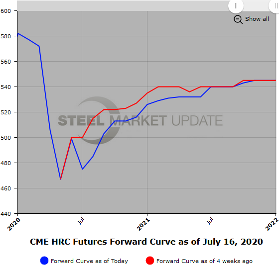 Below is a graph showing the history of the CME Group hot rolled futures forward curve. You will need to view the graph on our website to use its interactive features; you can do so by clicking here. If you need assistance with either logging in or navigating the website, please contact us at info@SteelMarketUpdate.com.