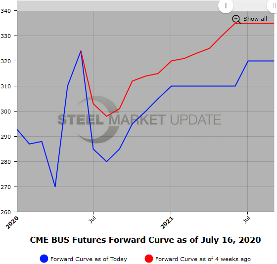 The early chatter around BUS suggests continued weakness as folks look for an additional $20/GT decline. Last month’s BUS price decline left a few folks surprised. Continued uncertainty surrounding business demand due to Covid-19 and the still low 56 percent capacity utilization rates being quoted for HR production could support the view. However, robust export prices for 80/20 partly due to a weak U.S. dollar could help buoy SHR and BUS prices in the coming month. We have seen a pickup in market inquiries for the BUS. Nearby BUS futures are trading just shy of $280/GT with about a $20-30 contango out to January 2021.