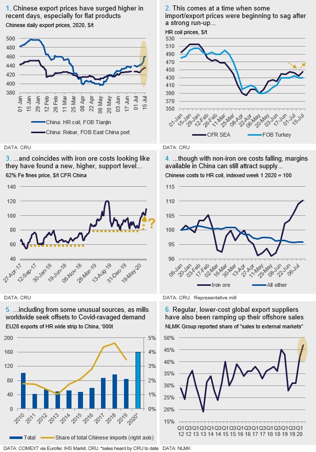 Strength in China has continued. Over recent days there has been a renewed surge upwards in Chinese export prices, especially for HR coil, which rose by a total of $17/t in just three trading days this week (see chart 1).
