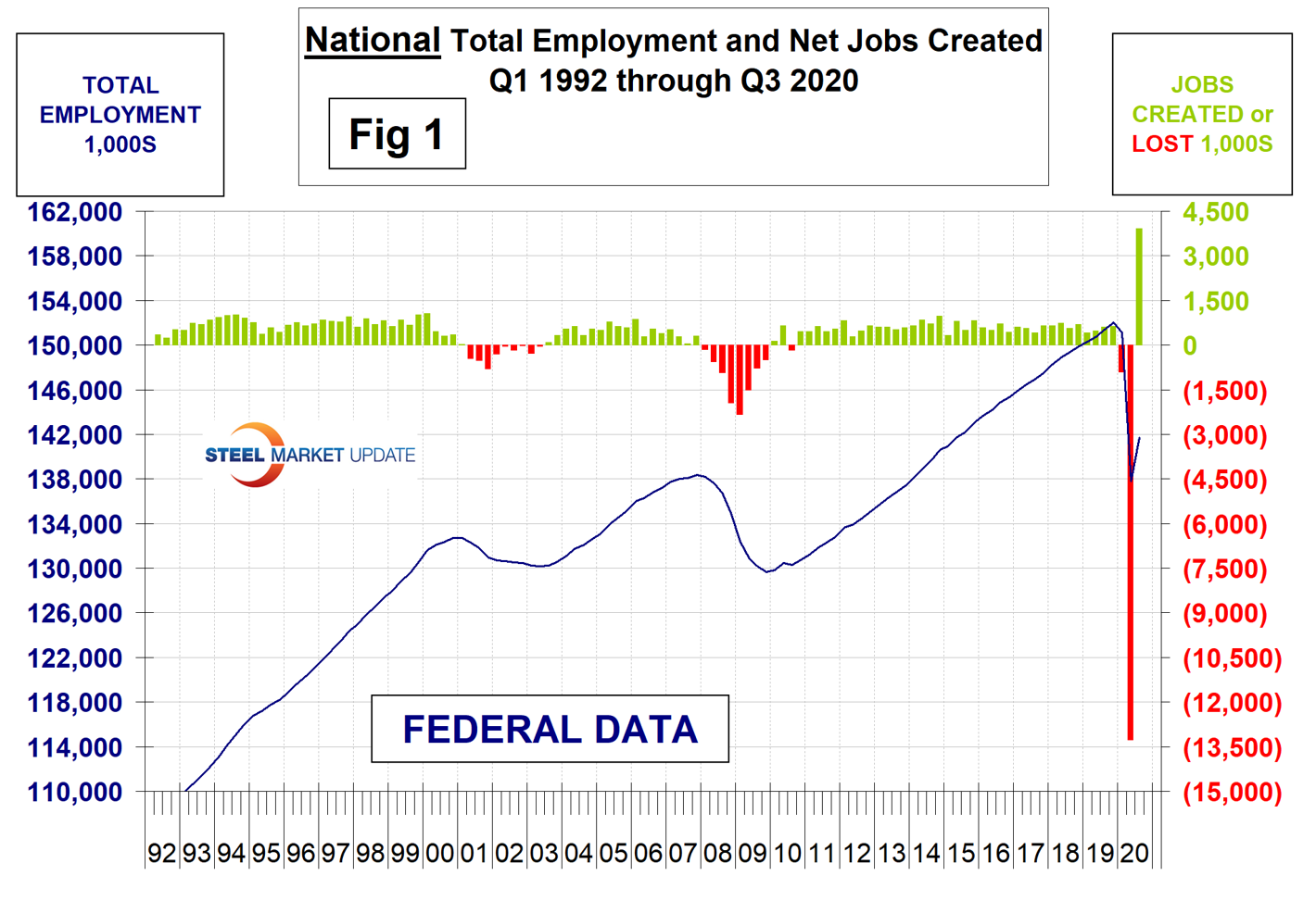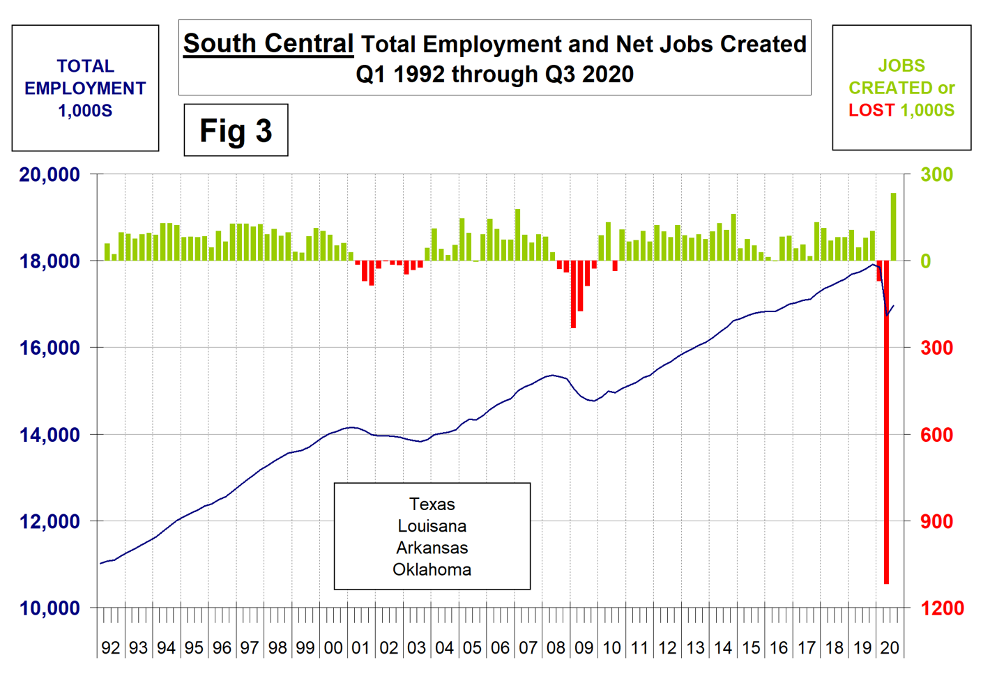 Third-quarter regional employment data by state was released by the Bureau of Labor Statistics (BLS) on Oct. 21. The state data follows and confirms the employment situation that we reported at the national level two weeks ago. The states compile their employment numbers independently of the feds, and then both are reported by the BLS. In the first three quarters of 2020, the states reported a total number of job losses of 10.076 million and the feds reported losses of 10.278 million. Our report covers only the lower 48 states and the state numbers don’t include individuals such as those in the military who are employed overseas. Therefore, the federal and state totals are close. Figure 1 shows the history of federal data totals since 1992 and Figure 2 shows the same format for the state data.