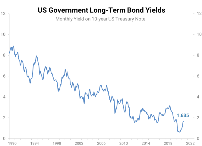 The next chart shows the U.S. Government 10-Year Bond Yield through the same period as in the Core Inflation chart above. This long-term yield is a function of the marketplace, versus the short-term interest rates the Fed controls/influences. So far, the 10-Year Yield has returned to its pre-COVID level and nothing more than that. We are not yet seeing any inflation concerns from this trend. Additionally, the yield curve is favorable (positive) and is also indicative of low inflation expectations.
