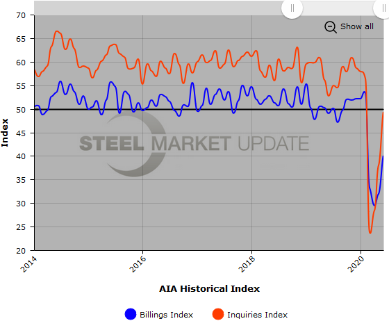 Below is a graph showing the history of the Architecture Billings Index and Inquiries Index. You will need to view the graph on our website to use its interactive features; you can do so by clicking here. If you need assistance logging in to or navigating the website, please contact us at info@SteelMarketUpdate.com.