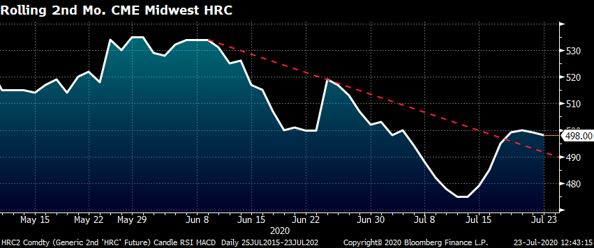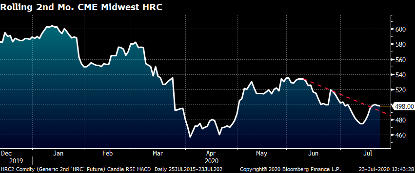 On Tuesday, U.S. Steel announced a $40/st price increase, which was followed by a number of other domestic mills. On Wednesday, U.S. Steel announced it is restarting its #8 blast furnace at Gary Works on Aug. 1, expecting higher demand in the weeks and months ahead. Futures have rebounded $15-$20 following the explosion at ArcelorMittal’s Burns Harbor facility last week. The rolling 2nd month CME Midwest HRC future popped above its downtrend that started in early June. Is this technical pattern confirmation that prices will move higher from here?