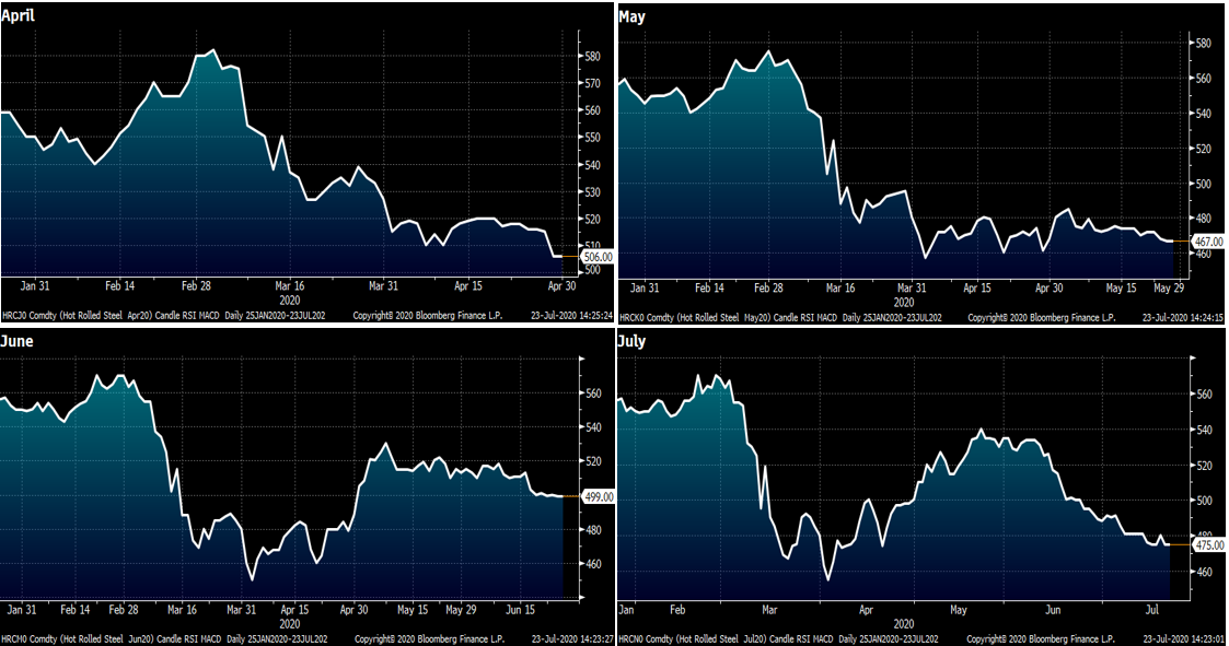 These four charts show the April, May, June and July CME Midwest HRC futures time series back to January.
