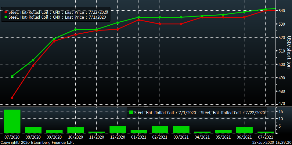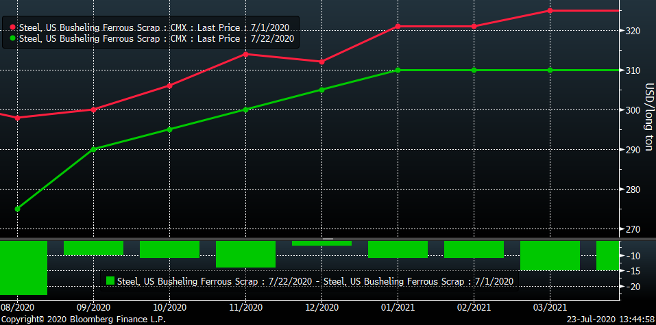 Despite this logistical issue, the busheling curve is in contango or upward sloping. Nevertheless, optimism for busheling remains with October and beyond trading around $300 indicating prices will increase off of July’s $278 settlement.