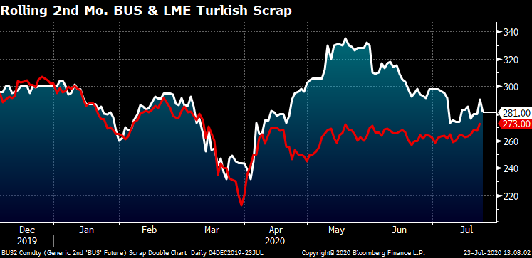 LME Turkish Scrap has started trading higher in the past few sessions with September settling today at $273. The spread between busheling and Turkish scrap has converged to $8 after expanding to as much as $70 only two months ago.