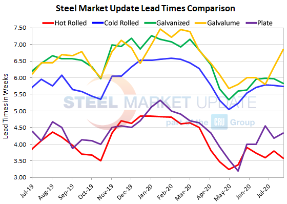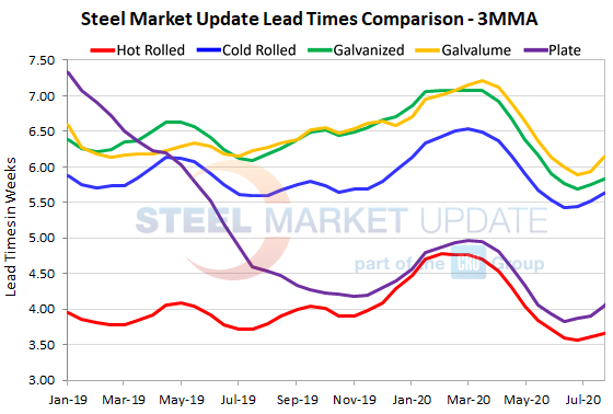Looking at three-month moving averages, which smooth out the variability in the biweekly readings, lead times for flat rolled and plate saw a small upturn for the second time in the past month. The current 3MMA for hot rolled is 3.66 weeks, cold rolled is 5.63 weeks, galvanized is 5.83 weeks, Galvalume is 6.13 weeks and plate is 4.04 weeks.