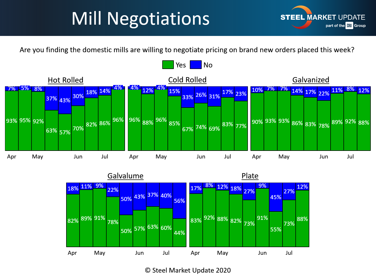 Steel buyers clearly have the upper hand in negotiations with steel makers given the challenging market conditions from the virus, with overwhelming percentages of those responding to Steel Market Update’s questionnaire this week reporting that the mills are open to price negotiations to win orders.