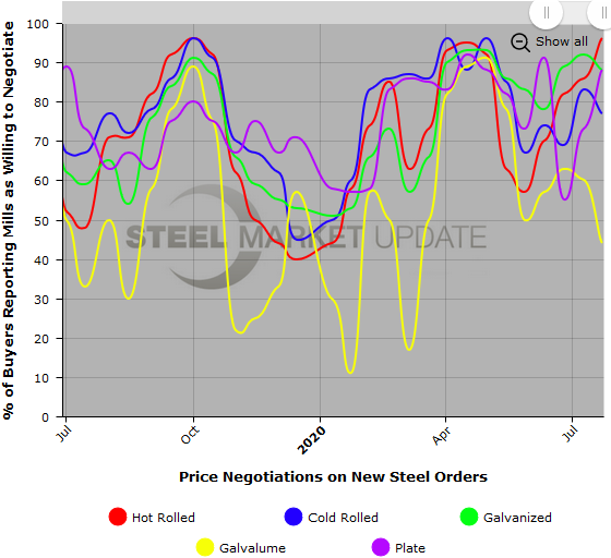 In the cold rolled segment, 77 percent reported the mills willing to talk price, down slightly from 83 percent two weeks ago.