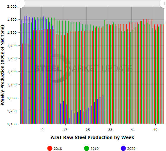 A possible indication that the economy and steel demand gradually continue to improve, domestic steelmakers increased raw steel production for the seventh week in a row to a total of 1,320,000 net tons in the period ending July 25 with the mills operating at an average utilization rate of 58.9 percent, reported the American Iron and Steel Institute. Production increased by 1.1 percent from the prior week when the utilization rate was 58.3 percent. However, the current week’s production still represents a 28.5 percent decrease from the same period last year due to the coronavirus.