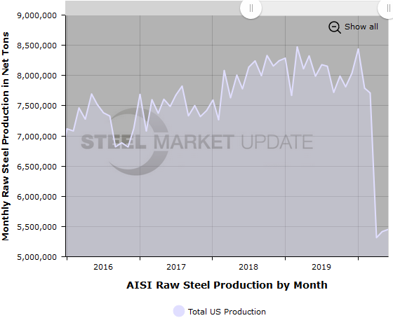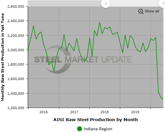 SMU Note: Interactive versions of these raw steel production graphics can be seen in the Analysis section of our website here. We have detailed regional data available as well, such as the example below showing monthly produciton in the Indiana region. If you need assistance logging into or navigating the website, contact us at info@SteelMarketUpdate.com.