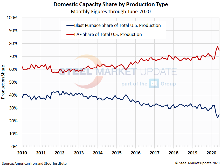 Broken down by production method, 4,070,000 tons (74.6 percent) were produced by electric arc furnaces (EAFs) and 1,383,000 tons (25.4 percent) were produced by blast furnaces. June recorded the highest EAF-produced share of total production in SMU’s 10-year history.