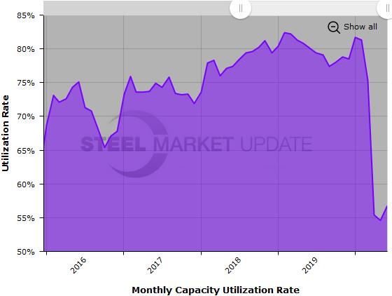 The mill capacity utilization rate for June averaged 56.8 percent, up from 54.6 percent in May, but down from 80.1 percent one year ago. The average capacity utilization rate for the year is now 67.8 percent, down from 81.2 percent in the same six-month period of 2019.