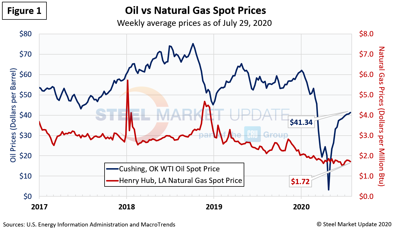 The spot market price for West Texas Intermediate (WTI) has rebounded somewhat from the plunge after the cornonavirus shutdowns, increasing to $41.34 per barrel as of July 29. Natural gas at the Henry Hub in Oklahoma was priced at $1.72 per MMBTU (million British Thermal Units) as of July 29, down from just over $2.00 at the beginning of the year. Analysts say the supply overhang, and weakened demand due to the pandemic, are likely to keep downward pressure on oil and gas prices for some time.