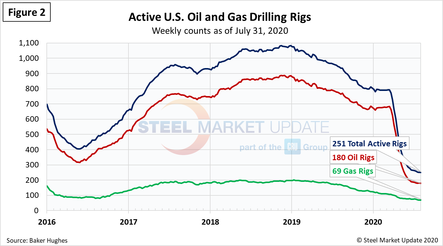 The decline in active U.S. rigs drilling for oil and gas has flattened as of last week to 251 rigs, including 180 oil rigs, 69 gas rigs and 2 miscellaneous, according to the latest data from Baker Hughes (Figure 2). That’s a decline of 68 percent from the 793 rigs in production in March prior to the coronavirus shutdowns. The table below compares the current U.S., Canada and International rig counts to historical levels.