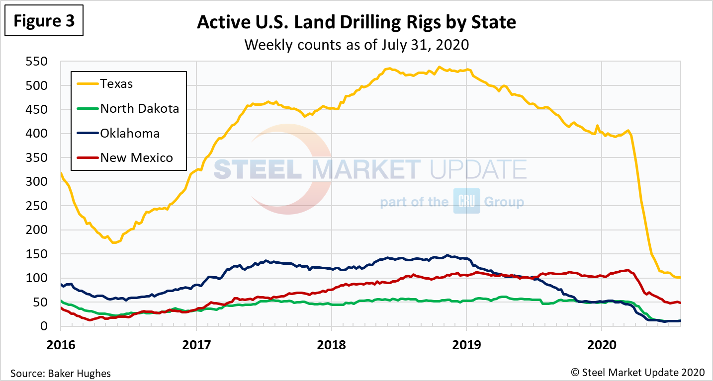 U.S. oil and gas production are heavily concentrated in Texas, Oklahoma, North Dakota and New Mexico, which have all seen declines of more than 70 percent in active drill rigs since mid-March. The rig count in Texas plummeted from 407 in mid-March to 101 as of last week (Figure 3).