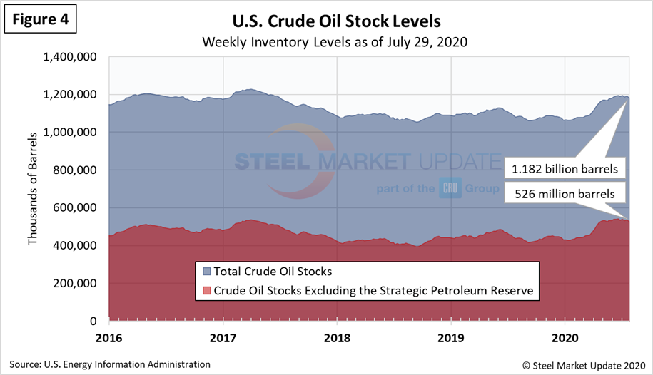 Total crude oil stocks in the U.S. have been on the rise since the beginning of the year, even before the coronavirus crisis, hitting 1.182 billion barrels as of July 29, up from just over 1 billion barrels at the beginning of the year (Figure 4).