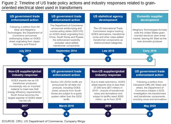 Given the critical role of the electric power grid to matters of economic growth and national security—GOES is considered a strategic material, and efforts to maintain a stable and diversified installed base of domestic production capacity is a key driver of regulatory intervention. As a result, GOES sheet has been subject to several trade measures in recent years, ranging from targeted antidumping investigations focused solely on GOES sheet from a shortlist of select producers or countries, to the much broader Section 232 enforcements on steel, which represent blanket enforcements on a variety of metal products from all countries, with few exceptions.