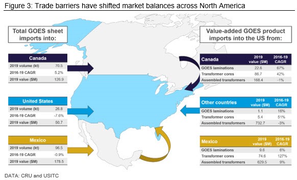 Following the original AD/CVD enforcements on grain-oriented sheet from major global producers, certain U.S. transformer manufacturers responded by shifting transformer core production capacity to Canada or Mexico. As a result, GOES sheet imports into Canada and Mexico have surged from China, Japan, and Russia, all of which are subject to the initial AD/CVD investigations in 2014 and Section 232 enforcements more recently in 2018. In turn, shipments of GOES-containing laminations and cores from Canada and Mexico into the U.S. have grown at an astounding compound annual growth rate (CAGR) of 46 percent and 80 percent from 2016 to 2019, respectively.