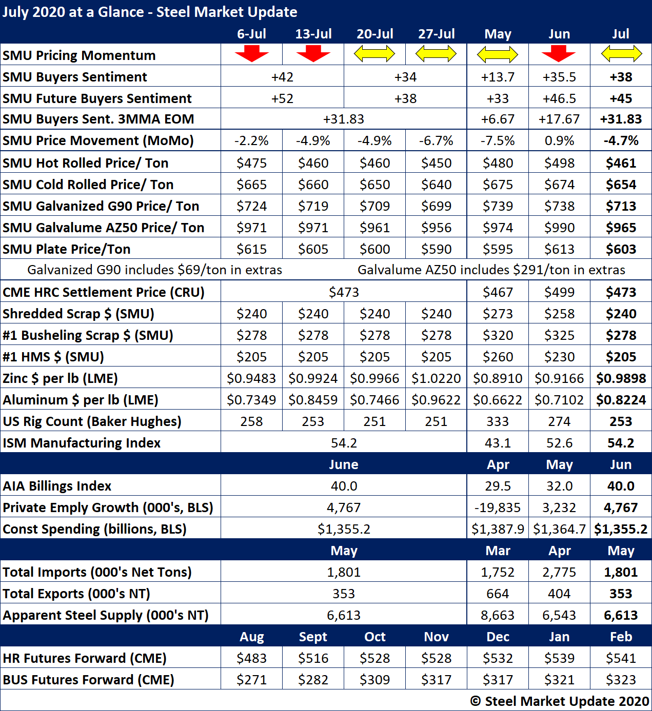 Steel prices declined throughout the month of July, although mills announced price increases in the third week of the month. As of last week, Steel Market Update’s hot rolled price average had declined to $450 per ton. Scrap prices declined from June to July by $18-48 per ton. SMU adjusted its Price Momentum Indicator from Lower to Neutral in mid-July.