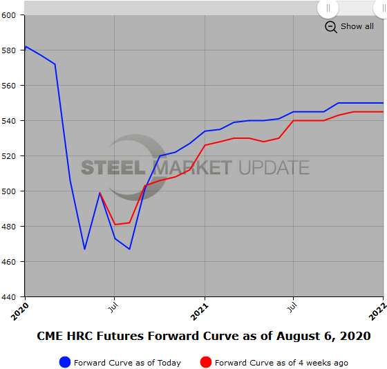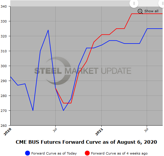Very strong export scrap markets have created some regional hotspots along the mid-Atlantic states. The chatter in scrap markets suggests there is potentially a strong divergence of opinion on where August BUS will settle even as the mills place their bids for scrap. Recent reports are that BUS will be down $10-20/GT from the Jul’20 $278/GT level, but recent Aug’20 BUS futures prices suggest that the price drop might be less. Today, Aug’20 settlement value was $270/GT.