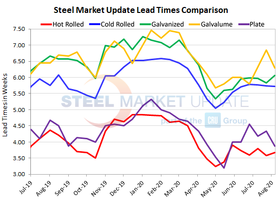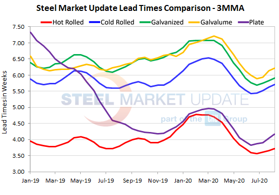 Looking at three-month moving averages, which smooth out the variability in the biweekly readings, lead times for flat rolled and plate have been inching upward for the past month. The current 3MMA for hot rolled is 3.71 weeks, cold rolled is 5.71 weeks, galvanized is 5.90 weeks, Galvalume is 6.21 weeks and plate is 4.16 weeks.
