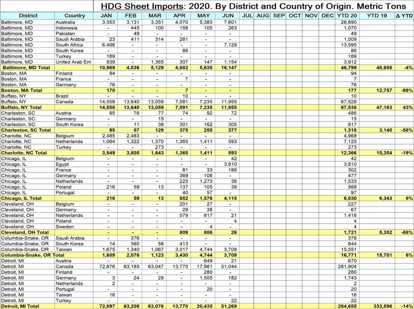 Flat Rolled Imports by District of Entry and Source Nation Through June 2020