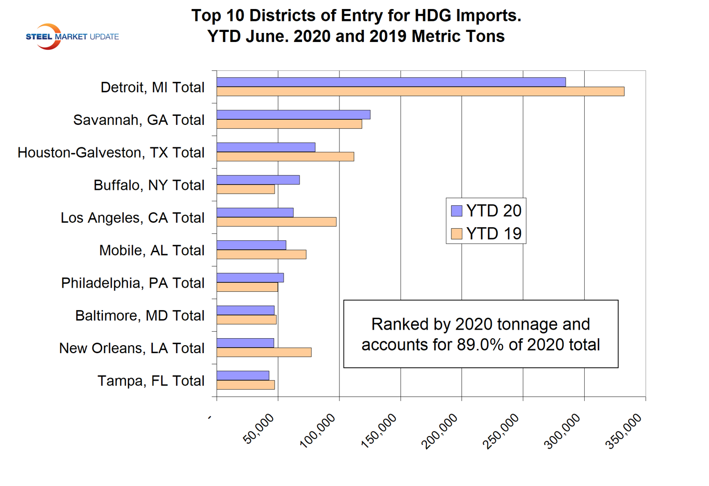 The table included here is a small part of the detailed analysis of the hot dipped galvanized sheet tonnage by district of entry and source nation. The bar graph shows the tonnage of HDG sheet that entered the top 10 districts through June year to date for 2019 and 2020 ranked by 2020 tonnage. These 10 districts accounted for 89 percent of the total HDG sheet tonnage in 2020 through June.