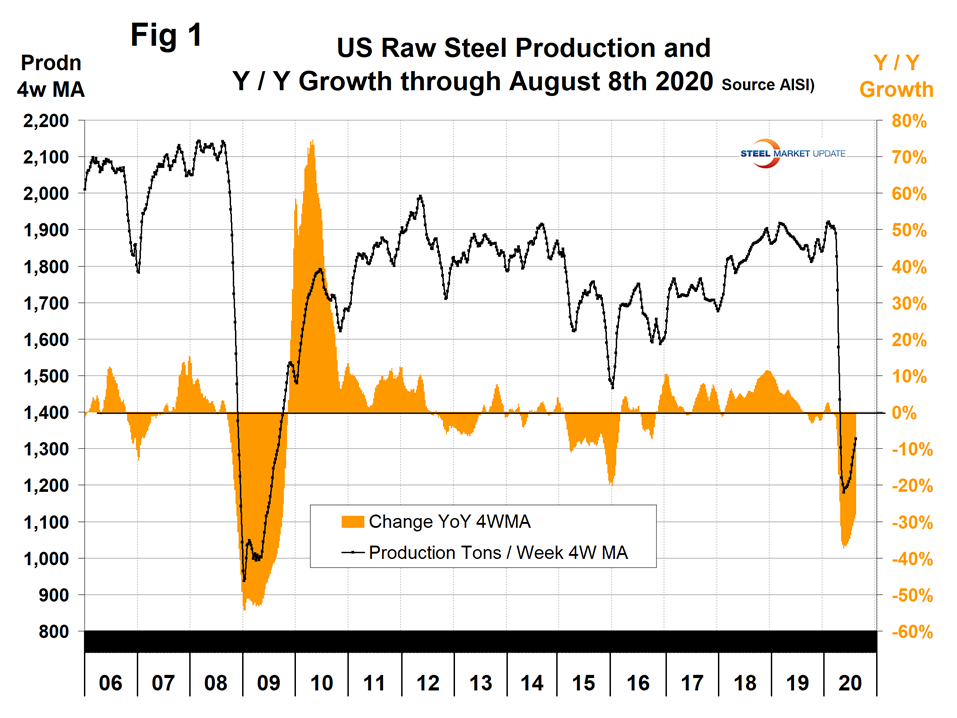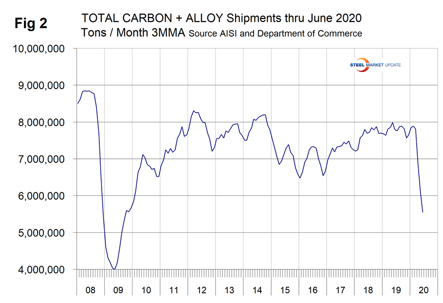 Figure 1 shows the abrupt decline in raw steel production that began in February and mirrors the rate of decline experienced in late 2008, though the total decline this time has not been as severe. The year-over-year decline in 2020 maxed out at 37.3 percent in the week ending May 16 and has since improved to negative 28.1 percent in the week ending Aug. 8. Back in 2009 the maximum rate of decline year over year was 54.3 percent in the week ending Jan. 17, 2009. These are four-week moving averages and are based on weekly data from the AISI.