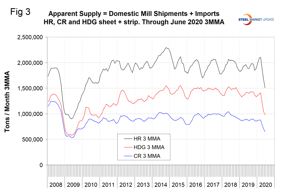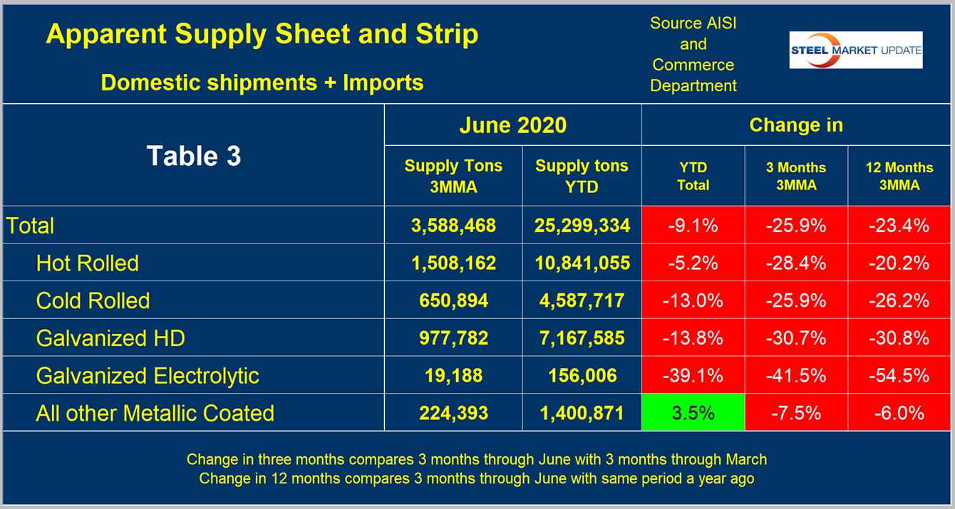 Table 2 describes both apparent supply and mill shipments of individual sheet products (shipments includes exports) side by side as three-month averages through June with year-over-year growth rates for each. Other metallic coated was down by far the least for both supply and shipments. Of the three major product groups, hot-dipped galvanized was down the most and hot rolled down the least. This was the case for both shipments and supply. In the three months through June 2020, the average monthly supply of sheet and strip was 3.588 million tons. There is no seasonal manipulation of any of these numbers. By definition, year over year comparisons have seasonality removed.