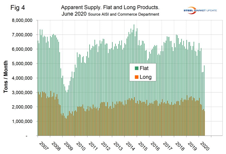 SMU Comment: The weekly numbers through Aug. 8 for crude steel production began to turn around in June. This analysis of monthly AISI data showed an uptick in the month of June that was obscured by the three-month average calculations used in this report. Comparing June to May, the supply of sheet products was up by 14.5 percent. Plate was up by 4.8 percent, longs were down by 7.2 percent, and tubular goods were down by 13.4 percent.