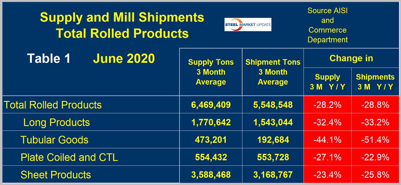 Table 1 is the shipment and supply situation for all product groups. Total supply (proxy for market demand) as a three-month moving average (3MMA) was down by 28.2 percent year over year. Apparent supply is defined as domestic mill shipments to domestic locations plus imports. Mill shipments were down by 28.8 percent meaning that imports took a slightly higher market share in the three months through June year over year. There is a big difference between products. Tubular products performed the worst, while sheet and plate products had the least severe decline. The supply of sheet products was down by 23.4 percent in three months through June year over year and domestic mill shipments were down by 25.8 percent. The total of coiled and discrete plate supply was down by 27.1 percent and shipments were down by 22.9 percent.