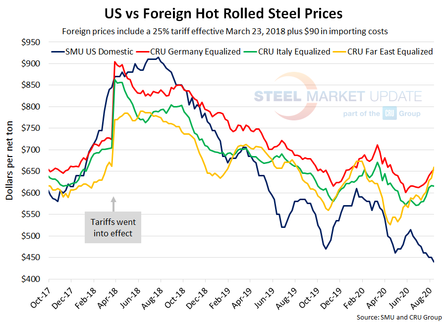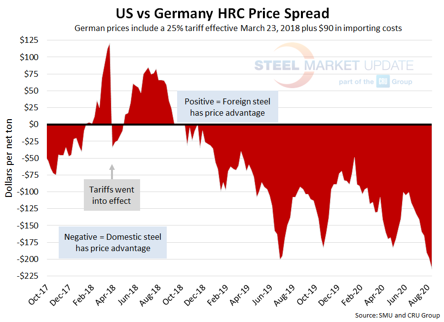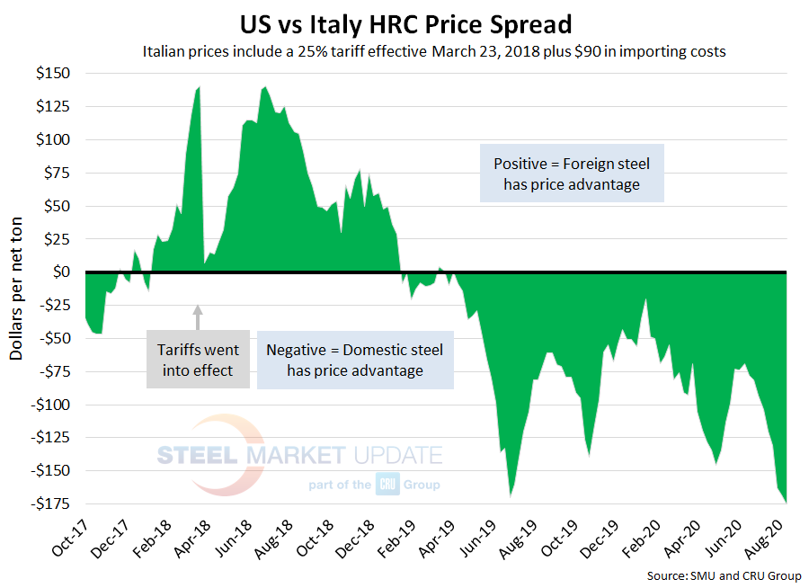 CRU published Italian HRC prices at $421 per net ton, down $1 from last week, but up $3 over two weeks ago. After adding tariffs and import costs, the delivered price of Italian HRC is approximately $616 per ton. Accordingly, domestic HRC is theoretically $176 per ton cheaper than imported Italian HRC; the spread was $168 the previous week and $163 two weeks prior. This is also the widest spread seen since mid-June 2019. U.S. prices have held this price advantage for over one year.