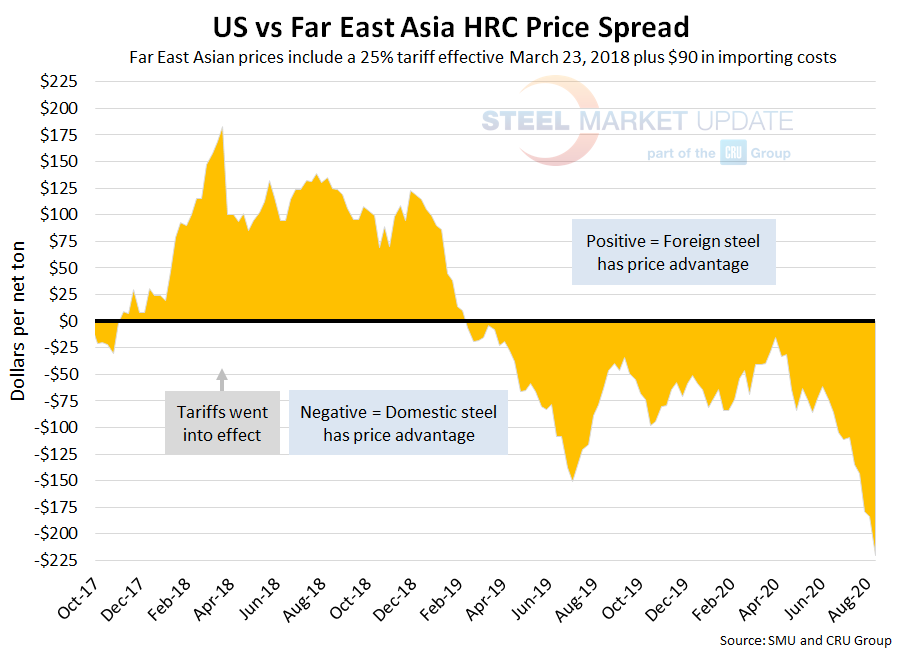 The CRU Far East Asian HRC price rose $21 per ton over last week to $456 per net ton, $25 higher than the price two weeks ago. Adding tariffs and import costs, the delivered price of Far East Asian HRC to the U.S. is $660 per ton. Therefore, U.S.-produced HRC is theoretically $220 per ton cheaper than imported Far East Asian HRC; the spread was $184 last week and $179 two weeks ago. Domestic prices have held this price advantage for a year and a half.