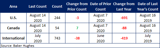 The number of active U.S. rigs declined by 3 to 244, with oil rigs down 4, gas rigs up 1, and miscellaneous rigs unchanged. Compared to this time last year, this week’s count is down 691 rigs, with oil rigs down 598, gas rigs down 95, and miscellaneous rigs up 2. See the first graph below for a history of active U.S. rig counts.
