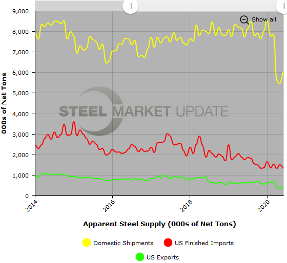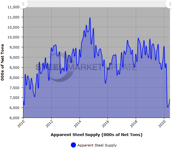 U.S apparent steel supply inched upwards in June to 6.93 million net tons, according to U.S. Department of Commerce and American Iron and Steel Institute data. While up over the previous month, April and May were the two lowest supply levels in the last 10 years at 6.54 million tons and 6.61 million tons, respectively. Apparent steel supply, a proxy for demand, is determined by combining domestic steel shipments and finished U.S. steel imports, then deducting total U.S. steel exports.
