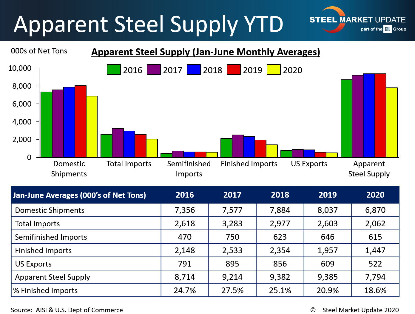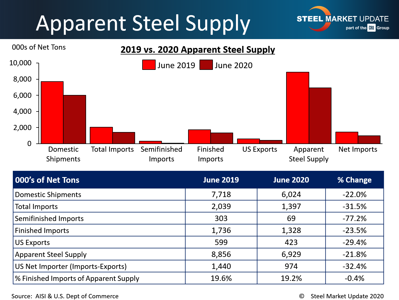 Compared to the prior month when apparent steel supply was 6.61 million tons, June supply rose 316,000 tons or 4.8 percent. This change was primarily due to a 562,000 ton increase in domestic shipments, which was somewhat countered by a 176,000 ton decrease in finished imports and a 69,000 ton increase in total exports.